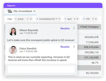 Communicate with budget owners as they track actuals and update financial plans. Keep everyone on the same page with a single source of truth created by assumptions posted directly on financial plans, not lost in emails.